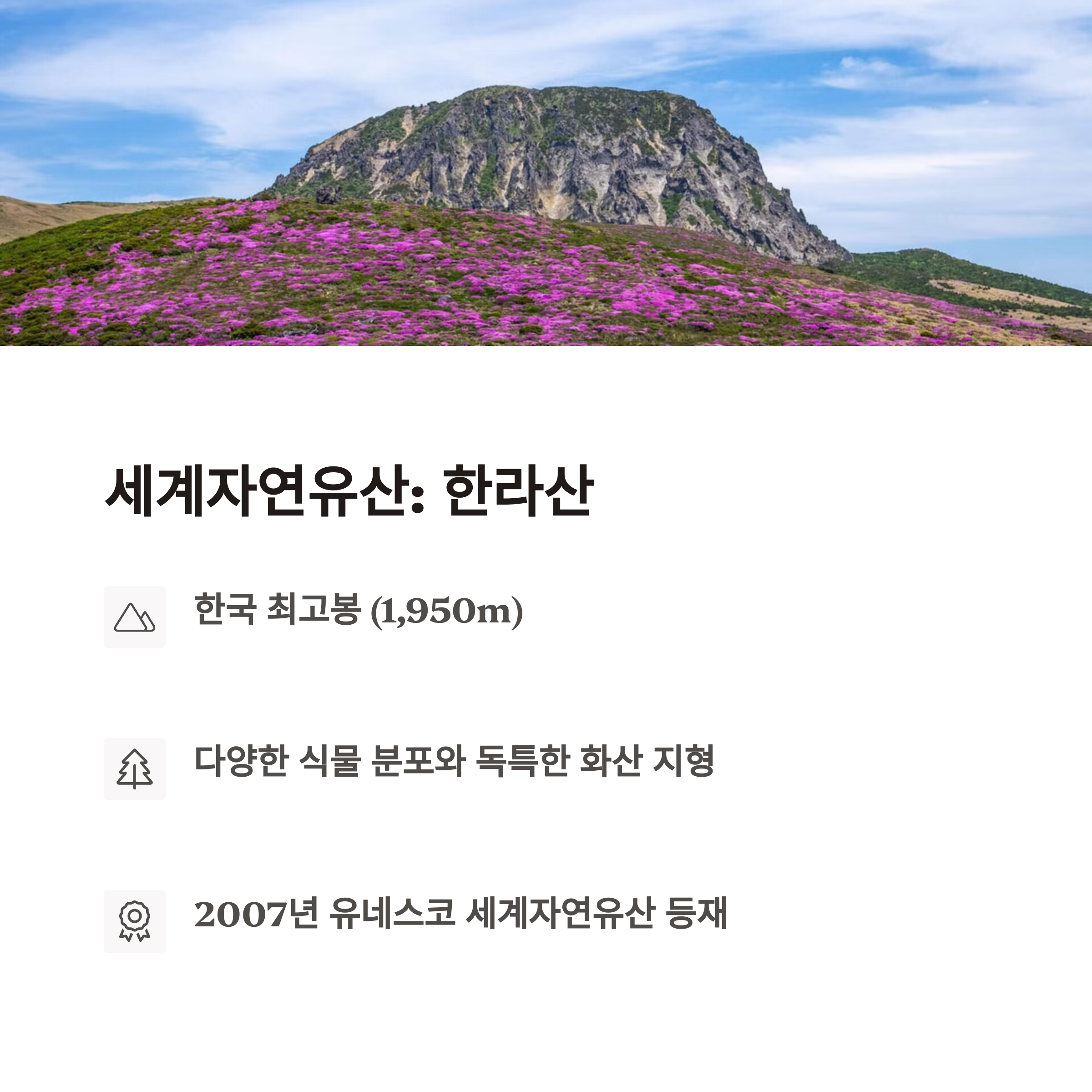 유네스코 3대 인증 제주도는 세계에서 유일하게 유네스코 3대 인증을 획득했습니다.