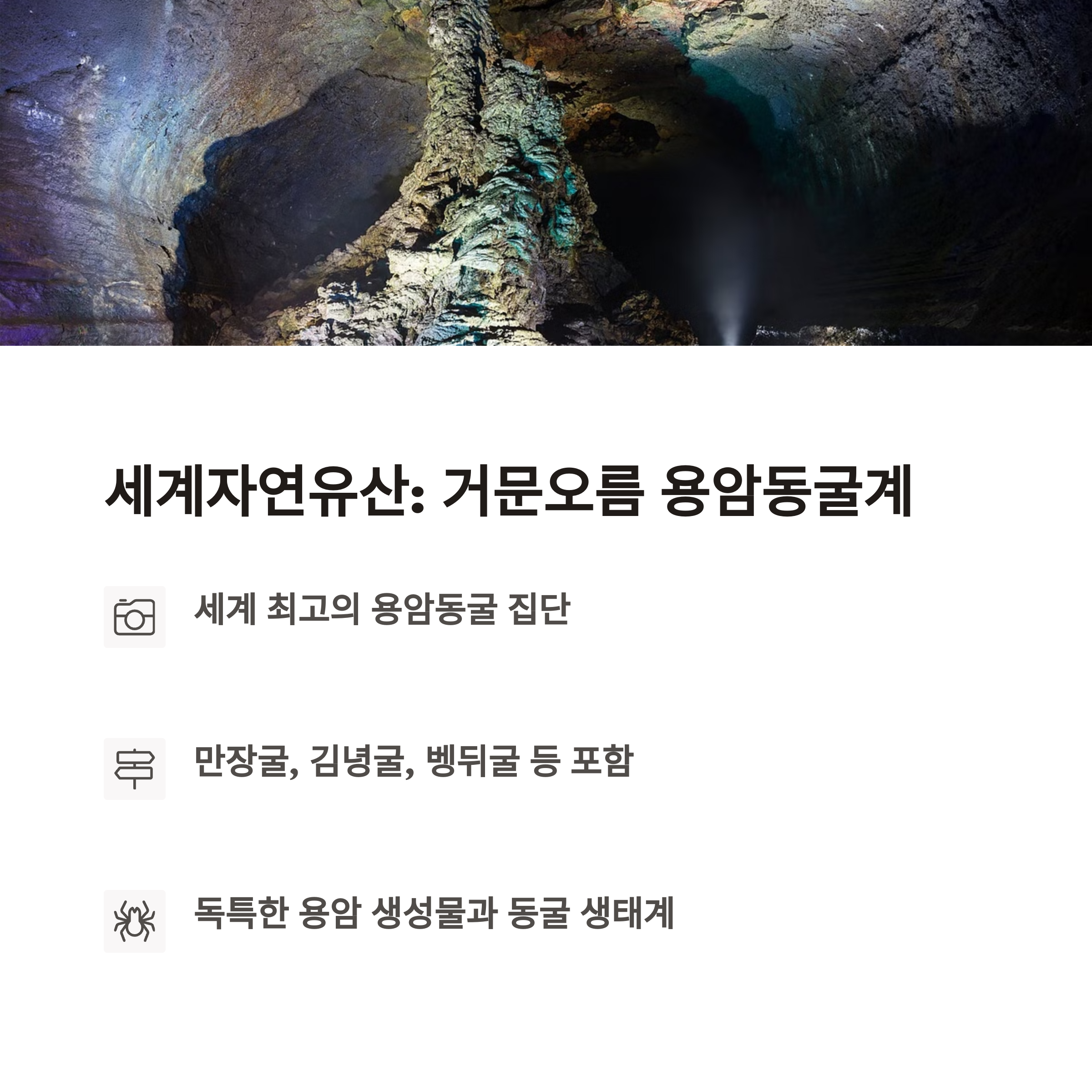 거문오름 용암동굴계는 세계에서 가장 뛰어난 용암동굴 시스템으로, 보존 상태와 학술적 가치가 매우 뛰어납니다.