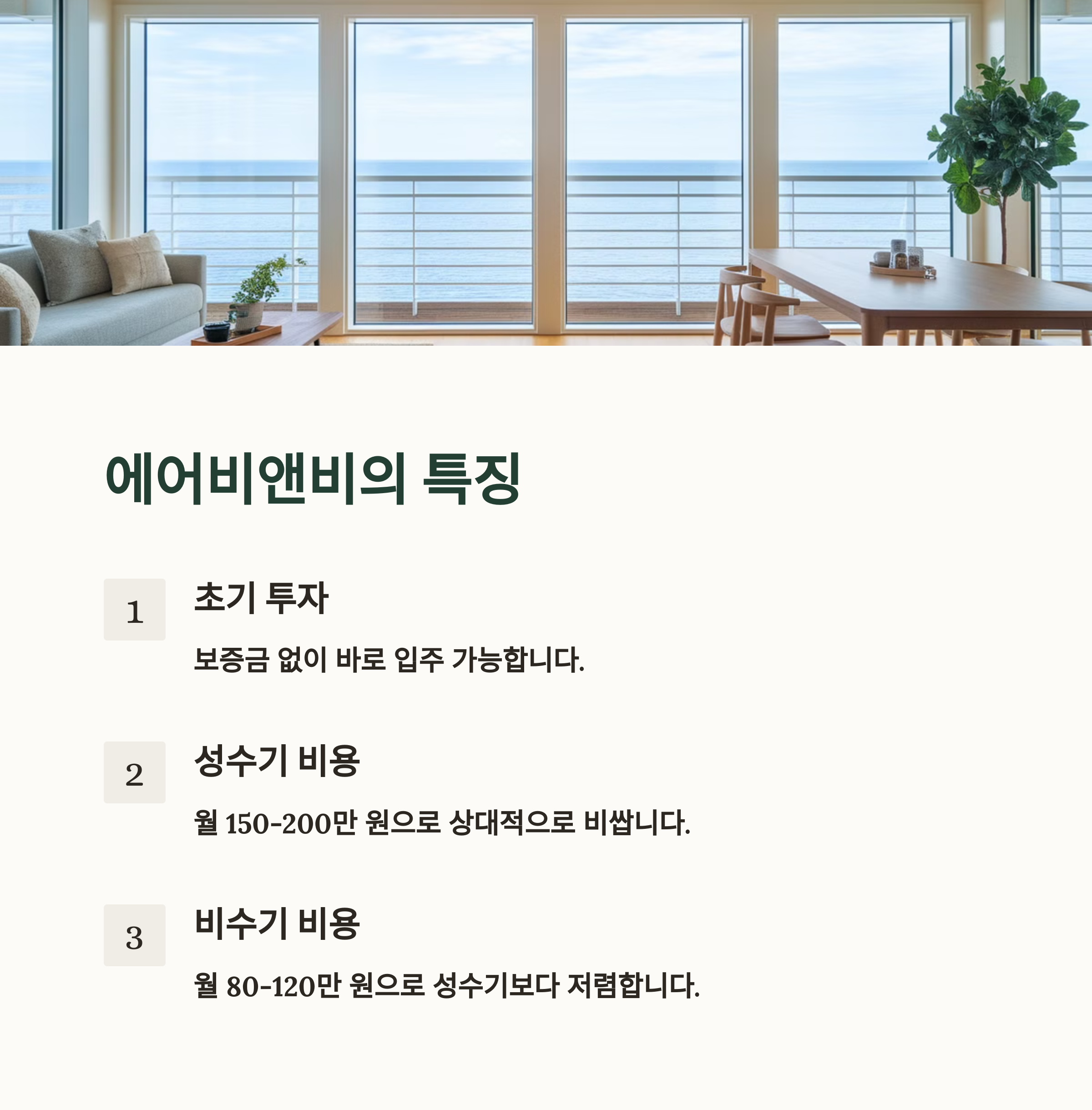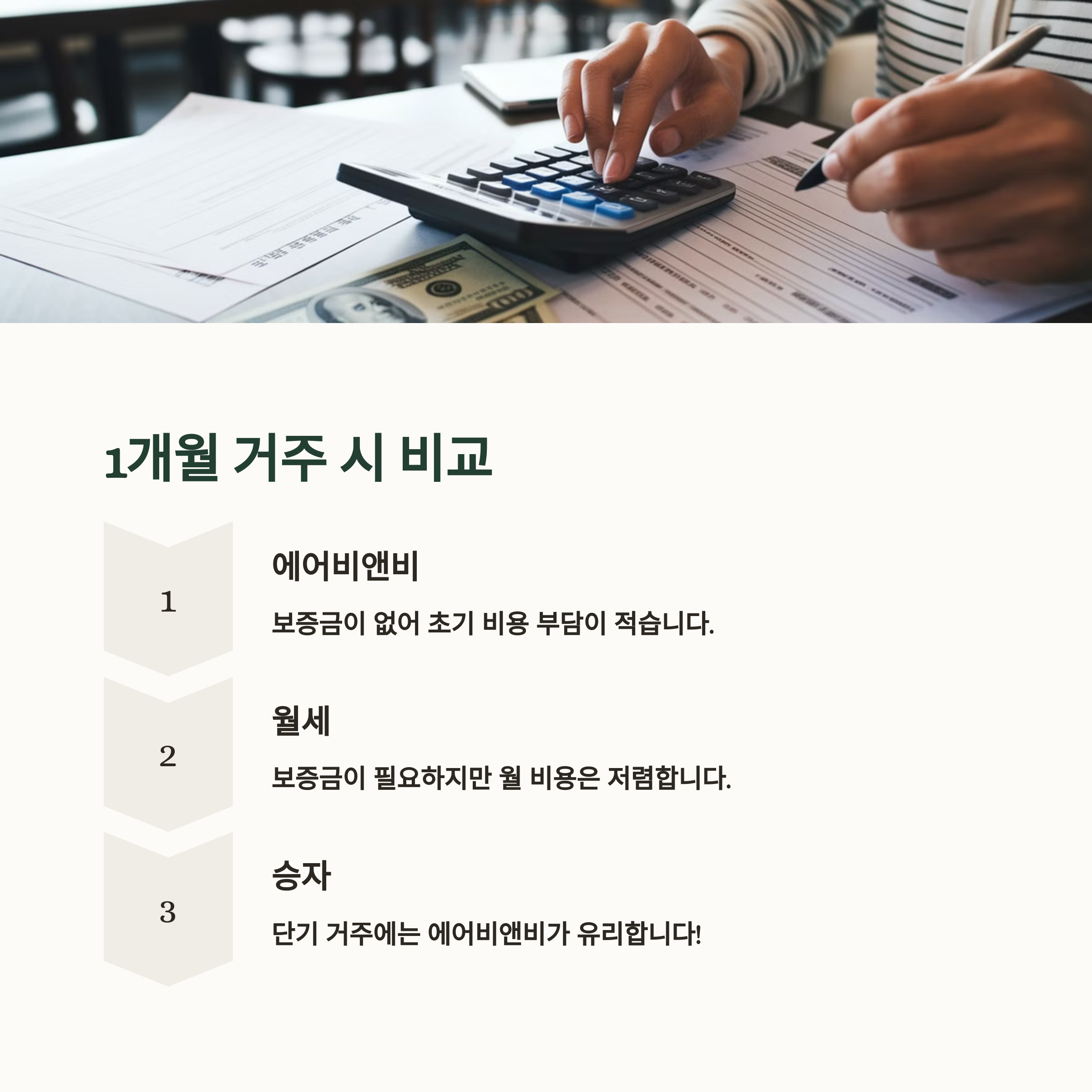 한 달 거주라면 보증금 없이 가구가 포함된 에어비앤비가 더 편리한 선택입니다. 하지만 성수기에는 가격이 크게 오르므로, 비수기를 이용하는 것이 경제적입니다.