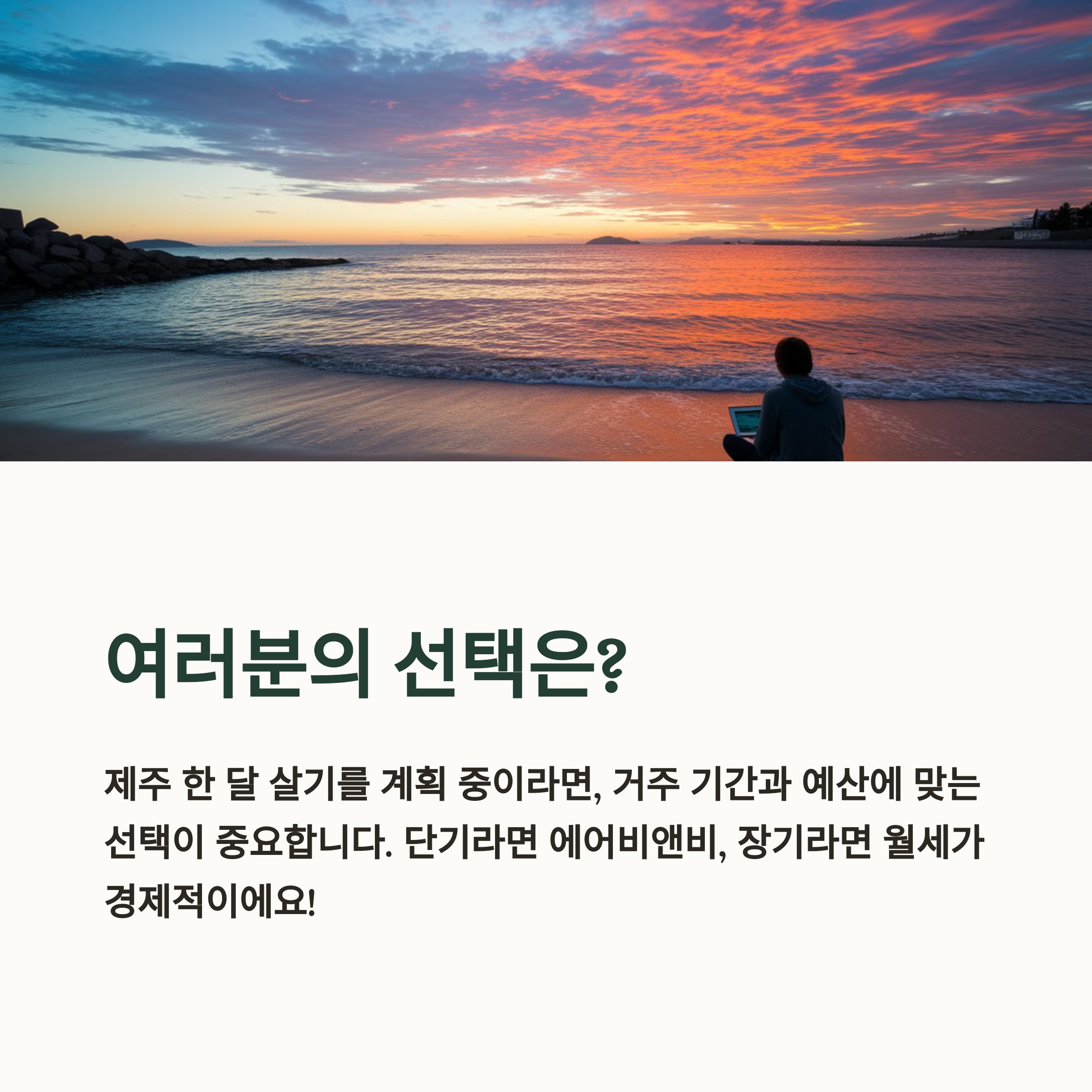 제주 한 달 살기를 해보셨나요? 월세와 에어비앤비 중 어떤 선택이 더 만족스러웠나요? 여러분의 경험과 의견을 댓글로 남겨주세요!