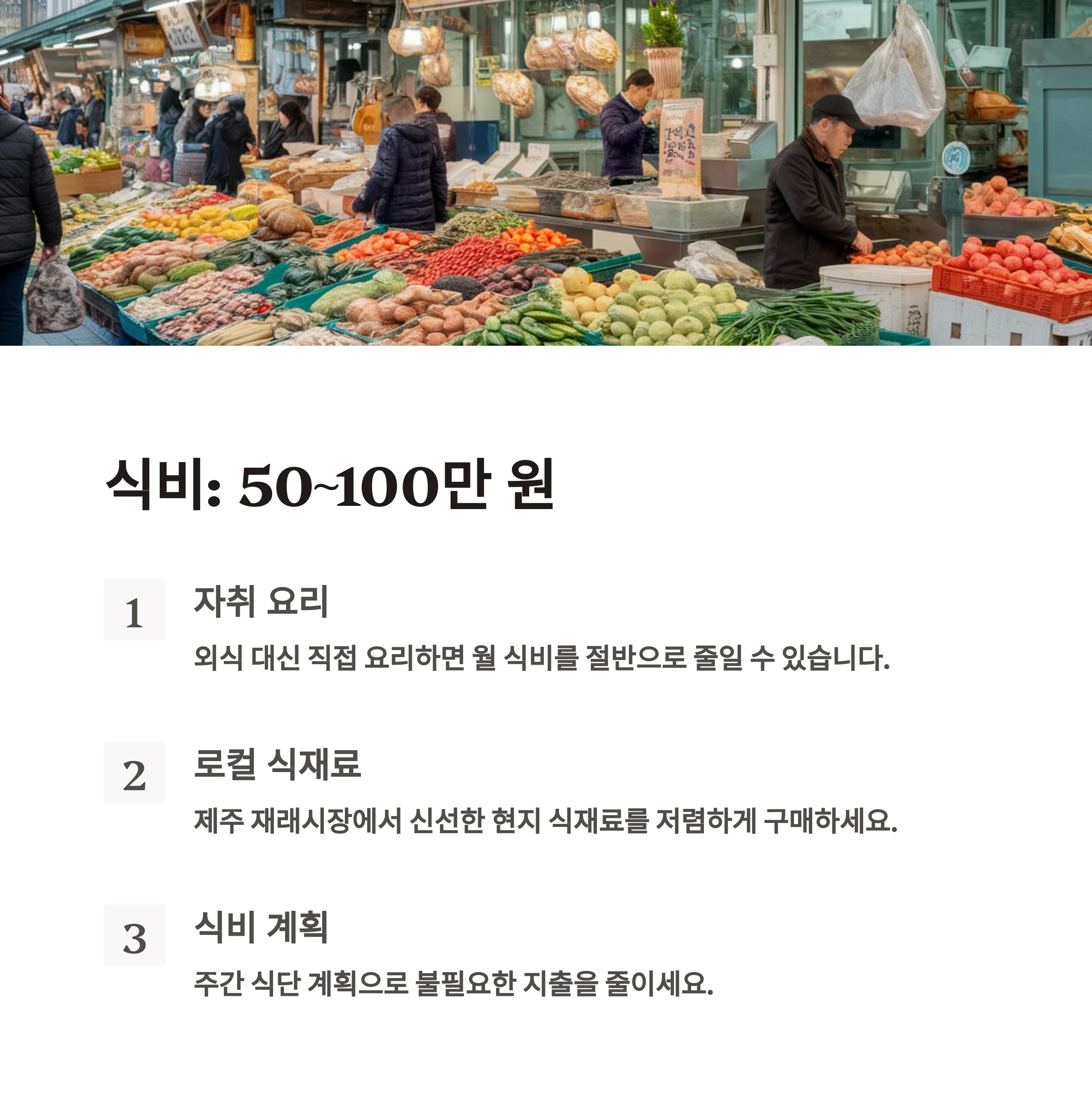 식비는 개인의 라이프스타일에 따라 달라지지만, 일반적으로 한 달 50만 원~100만 원 정도 예상해야 합니다. 외식을 자주 하면 비용이 크게 늘어나므로, 마트에서 장을 보고 직접 해 먹는 것이 절약하는 방법입니다. 특히 제주에서는 농산물과 해산물을 저렴하게 구입할 수 있어, 현지 재료를 활용하면 더욱 경제적으로 생활할 수 있습니다.