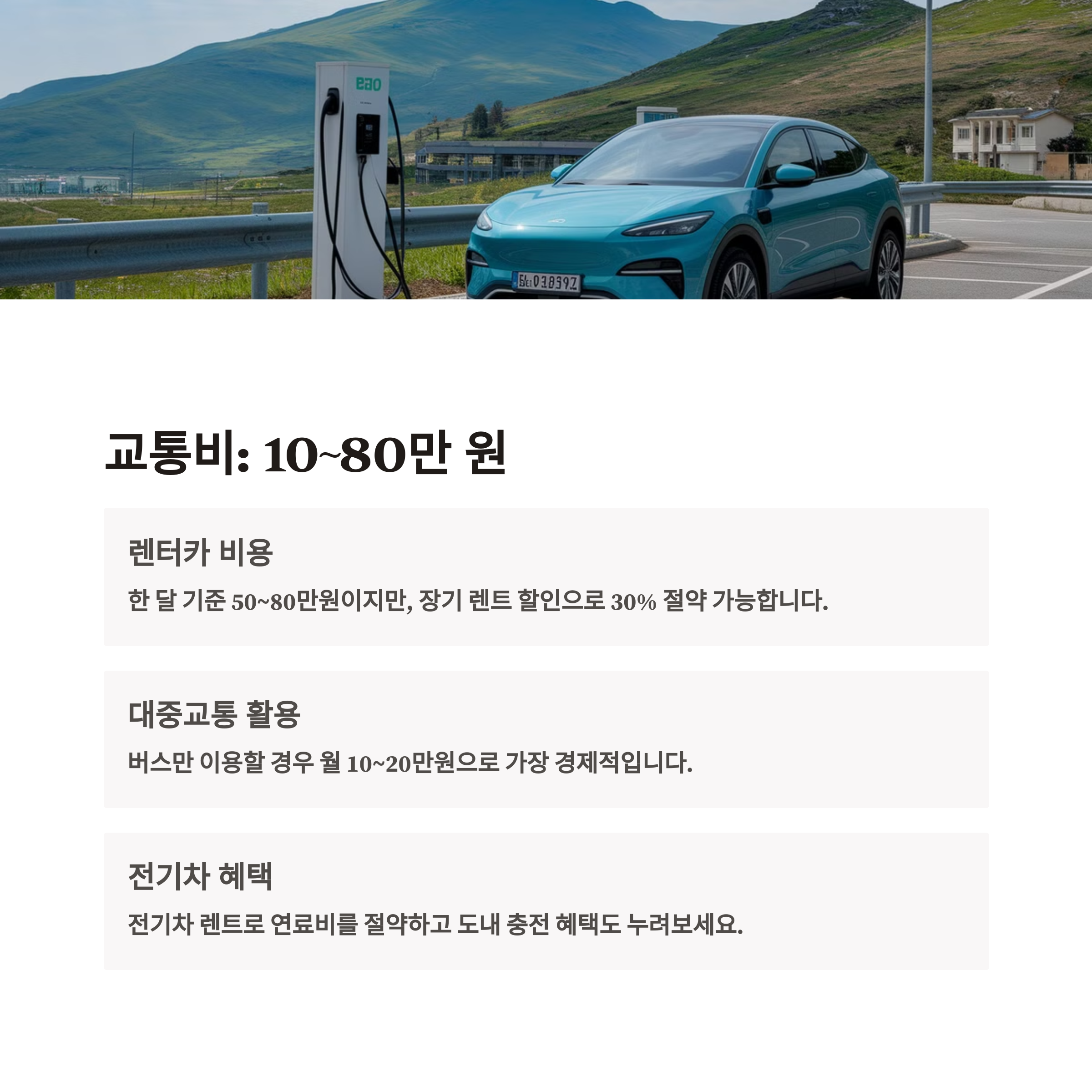 | 교통비 | 10~80만 원 | 전기차 렌트, 대중교통 활용 |