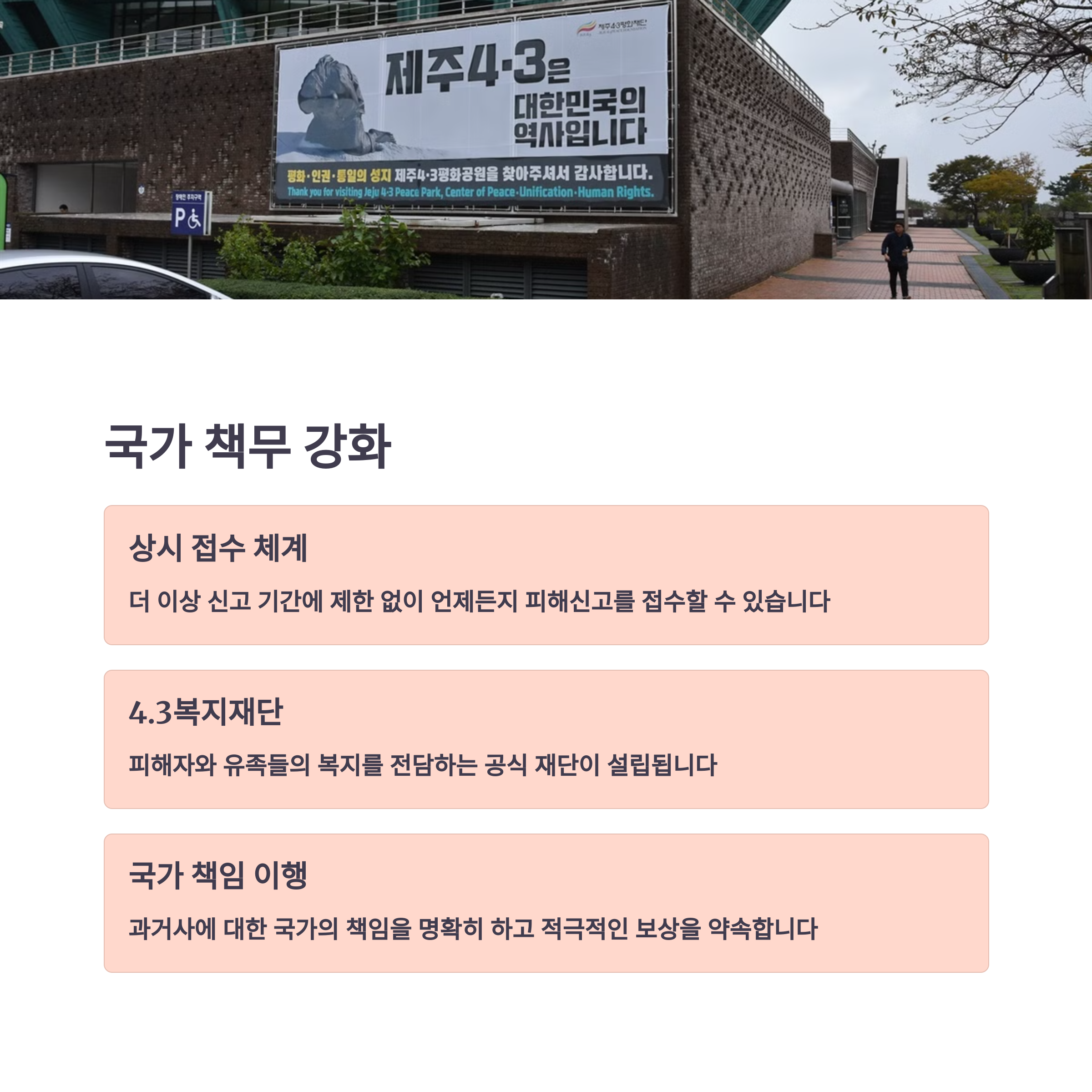 역사 왜곡 방지 및 공동체 회복도 중점적으로 다뤄졌습니다. 제주 4.3 사건을 왜곡하거나 희생자 명예를 훼손할 경우 처벌할 수 있는 조항이 새롭게 신설되어, 향후 역사적 진실을 보존하고 잘못된 인식 확산을 막는 데 큰 역할을 할 것으로 기대됩니다. 또한 화합과 치유를 위한 국가적 책무 강화를 통해 피해자와 유족의 의견을 반영한 다양한 복지사업과 트라우마 치유가 가능해졌습니다. 복지재단 설립과 트라우마센터 법인격 부여 등은 실질적인 회복 지원의 기반이 될 것입니다.