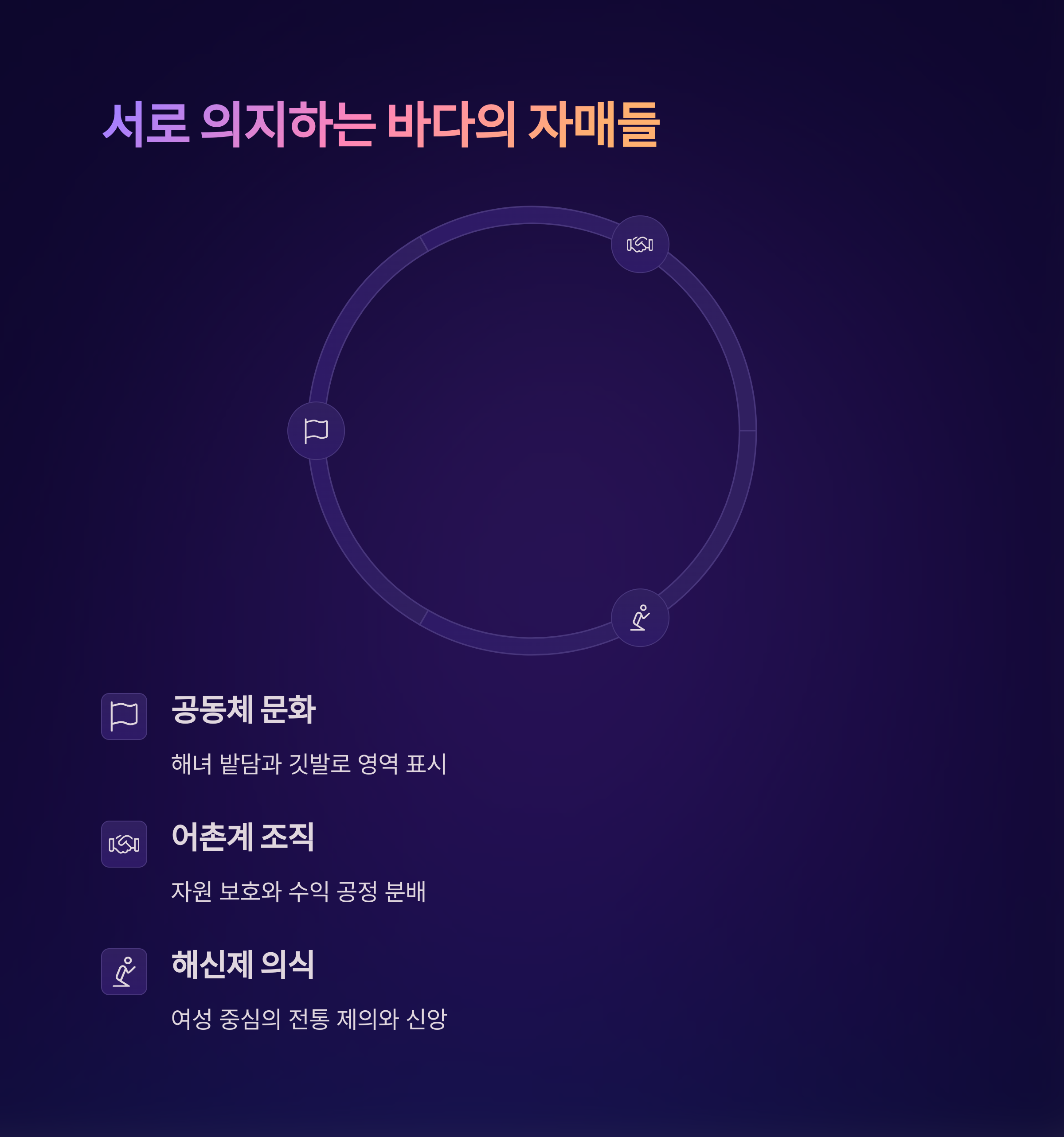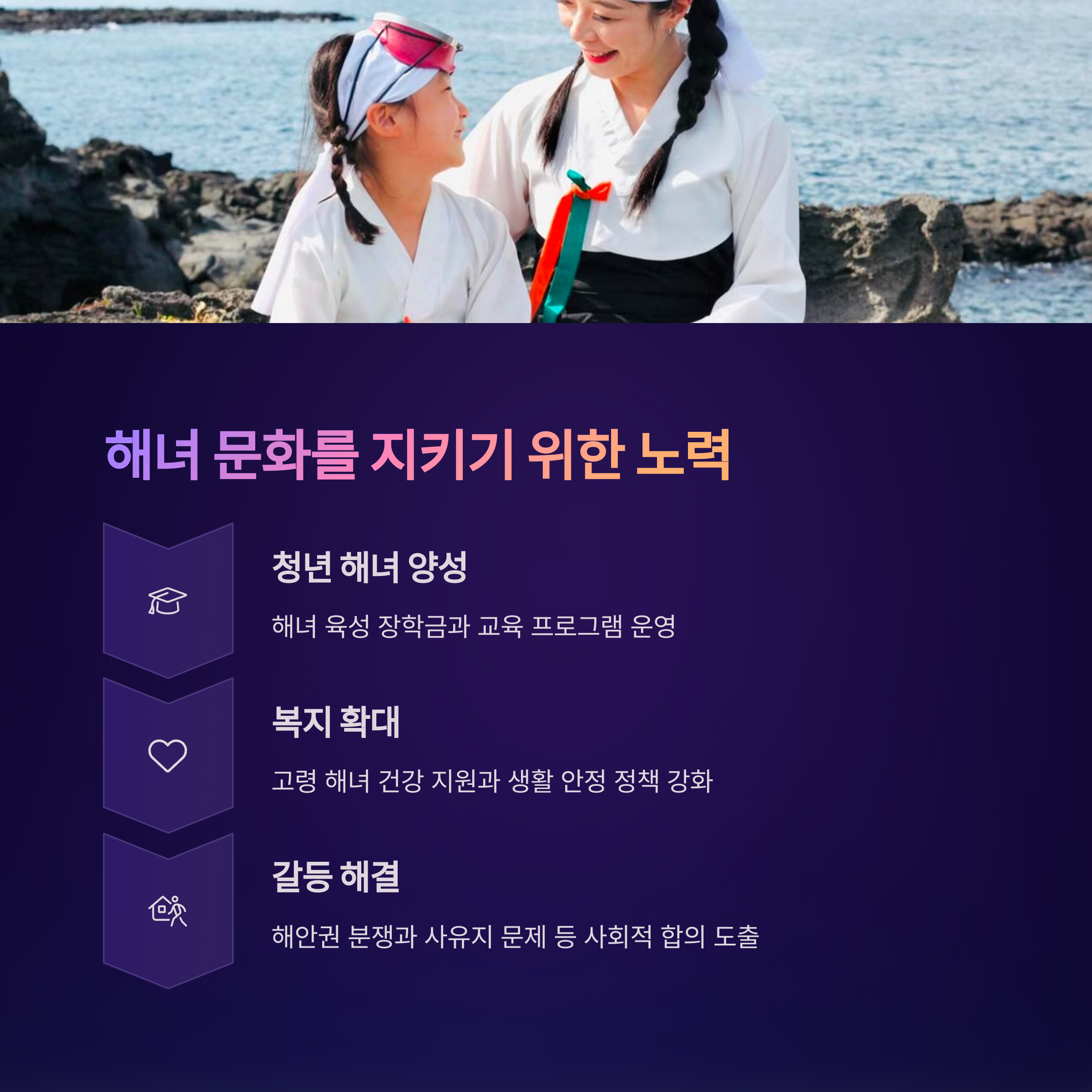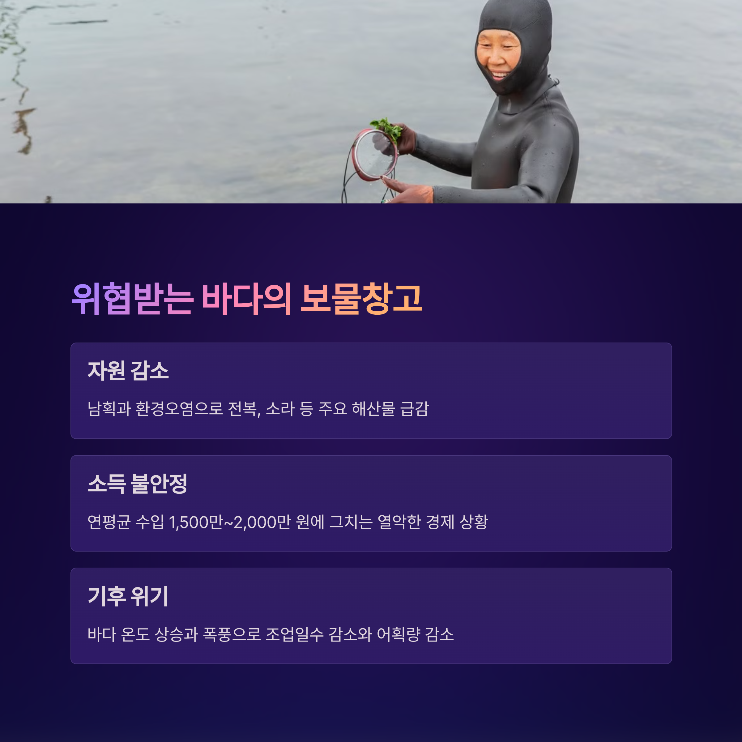 | 첨단 장비 없이 자연과의 동화로 수확 | 해녀 간의 안전 확인 및 공동체 정신 표현 | 후계자 부족, 생태 위기와 함께 문화 소멸 우려 |