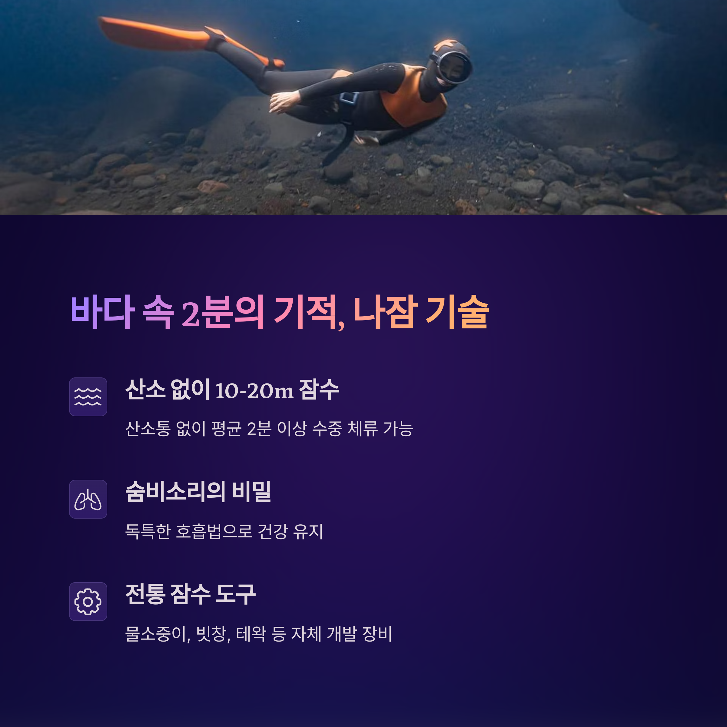 | 생존 기술 | 맨몸으로 잠수하며 익힌 숨의 컨트롤 |