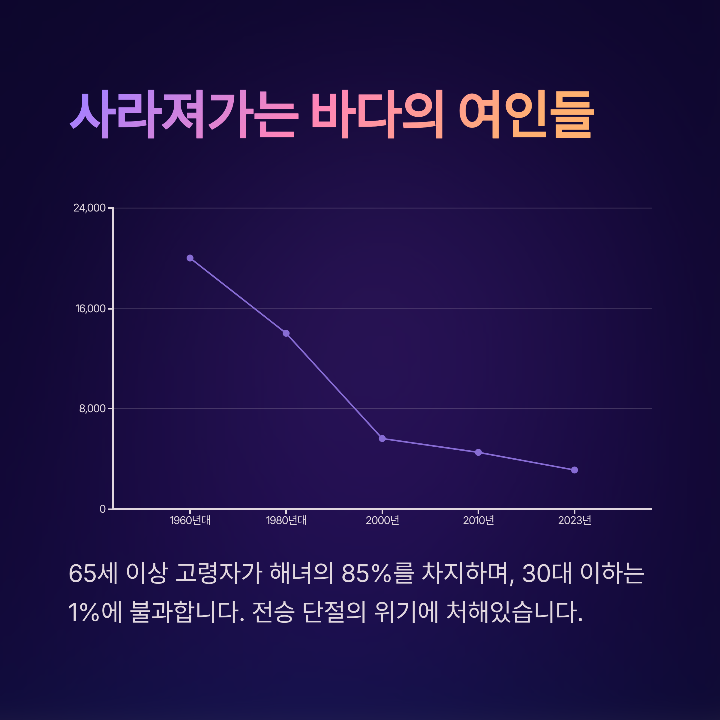 제주 해녀는 이제 2,800명 수준으로 줄었고, 이들 중 90% 이상이 60세가 넘는 고령자입니다. 고령화, 바다 생태계 변화, 경제적 현실은 해녀 문화를 위협하고 있습니다. 새로운 세대의 유입은 거의 없으며, 일부 해녀는 생계유지를 위해 다른 일도 병행합니다. 이러한 상황 속에서도 해녀들은 자신의 삶과 공동체를 지키기 위해 오늘도 바다로 향하고 있습니다.