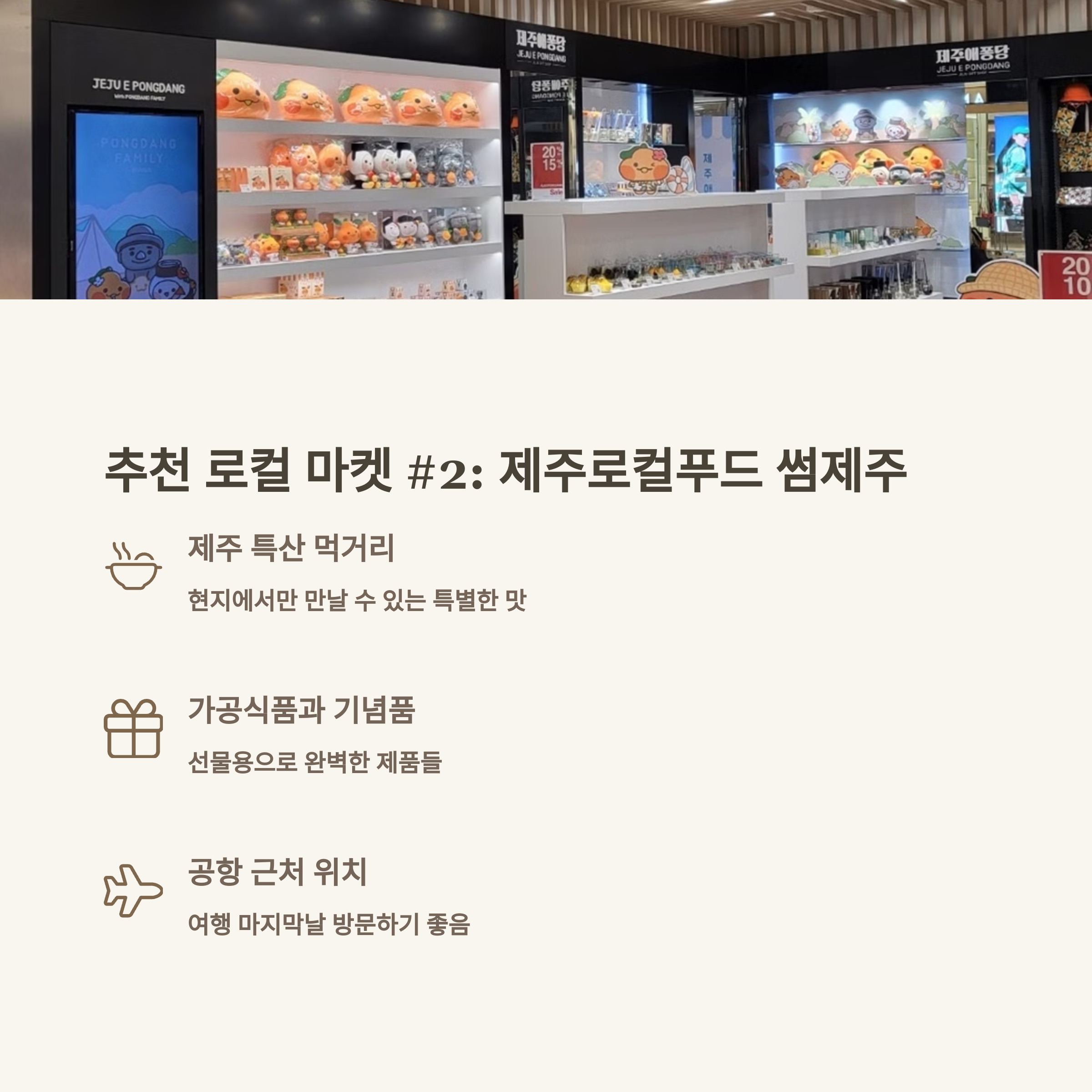 | 제주로컬푸드 썸제주 | 당근파이, 오메기떡 | 특산 먹거리와 기념품 구매 가능 |