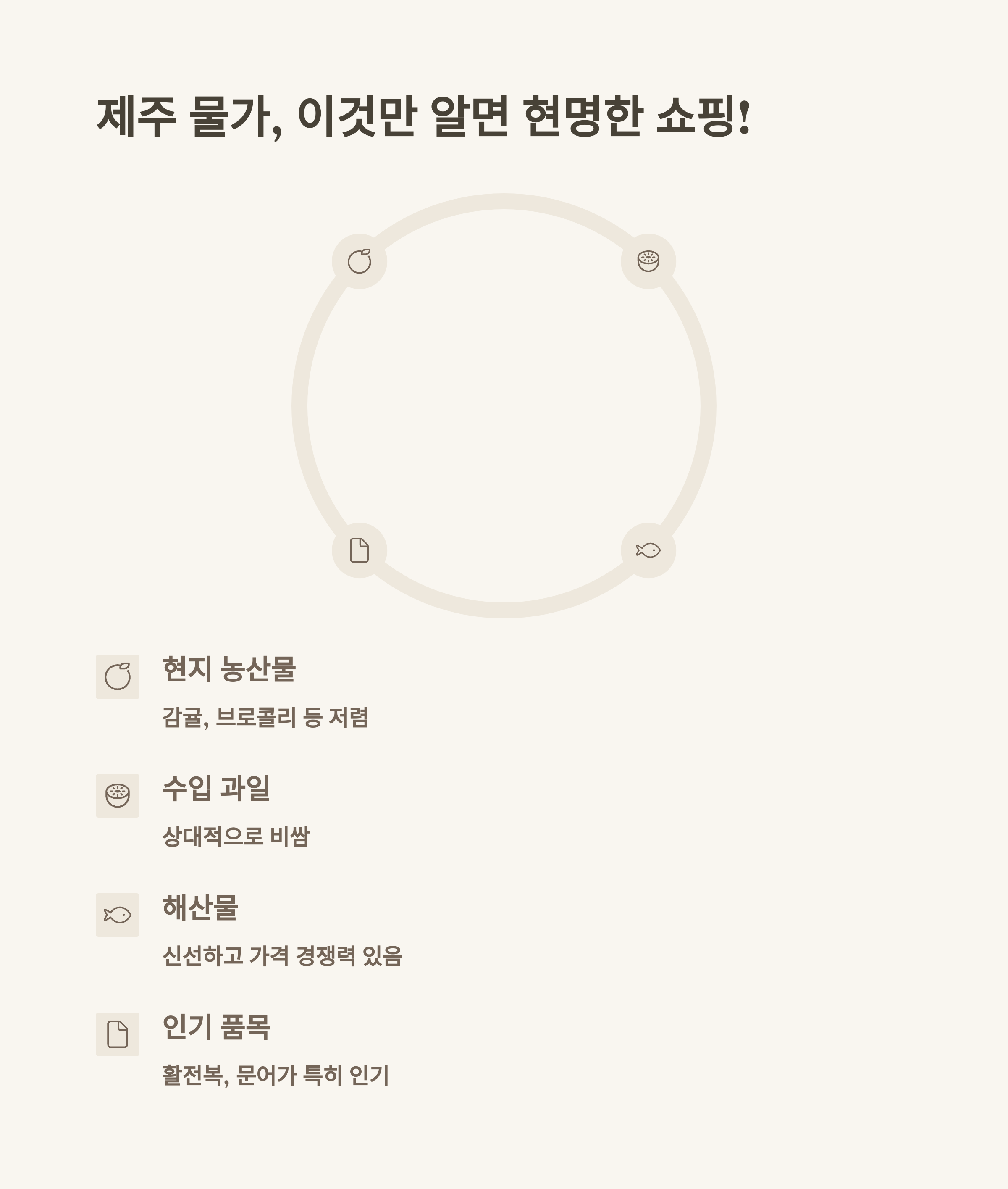 제주는 육지보다 비싼 품목과 저렴한 품목이 혼재되어 있습니다. 감귤류(천혜향, 레드향)나 제주산 당근, 브로콜리 등은 육지보다 저렴하게 구매할 수 있지만, 수입 과일(바나나 등)은 상대적으로 높은 가격을 형성하고 있습니다. 해산물은 육지보다 신선하고 저렴한 편으로, 활전복(10개 기준 약 만 원)이나 문어 등의 가격이 경쟁력이 있습니다.